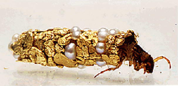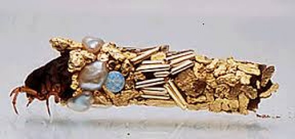«Caddisfly larvae live in fresh water and naturally construct elaborate protective tubes for themselves from materials found in their environment. Under natural conditions they use the objects found in their stream bed homes such as pieces of wood, fragments of fish bone or crustacean shell, grains of sand, plant debris and small stones. The tubes serve various purposes; the stones are used to increase traction in fast-moving streams, they serve as disguise for the soft-bodied insect and the spiky bits make the tube and thus, the fly larva, more difficult for predators to swallow.